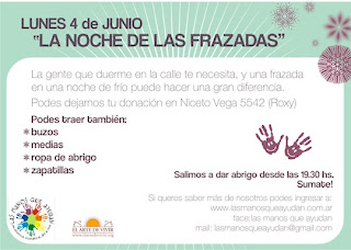 El próximo lunes 4 la ONG Las Manos que Ayudan  organiza una nueva campaña solidaria: "La noche de las frazadas". Se juntan colchas y ropa (camperas, buzos, medias, zapatillas) para ayudar a las personas que viven en la calle a pasar el invierno. Las donaciones se reciben en Niceto Vega 5542. Ese día, los voluntarios partirán a distintos puntos de la Ciudad de Buenos Aires para repartir lo recolectado. Todo aquel que quiera sumarse puede hacerlo acercándose al punto de encuentro de Niceto Vega a las 19.30.